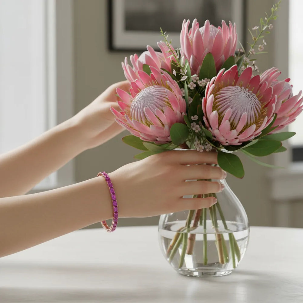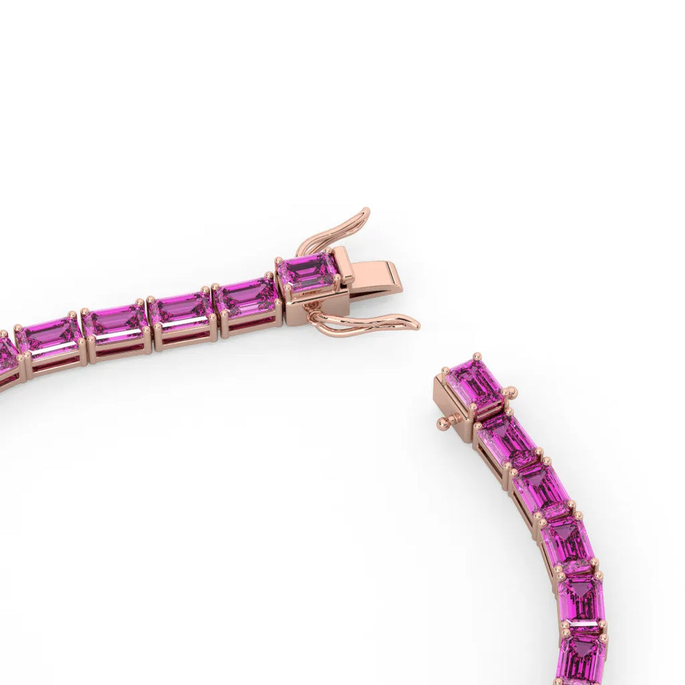 Exquisite, im Labor gezüchtete rosa Saphire im Smaragdschliff, jeder Stein mit zarten Rosatönen, sorgfältig in ein zeitloses Tennisarmband-Design eingefasst.