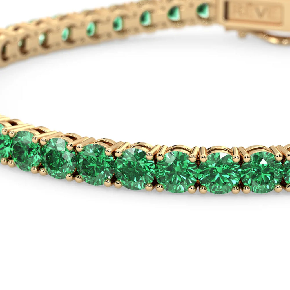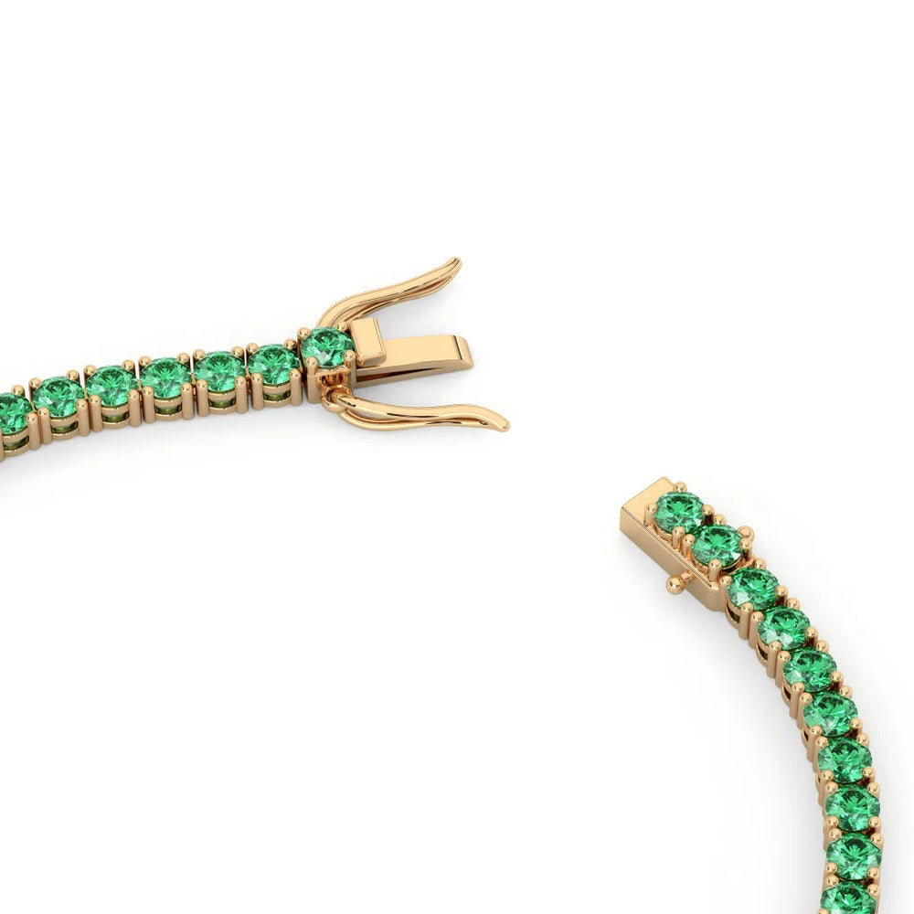 Jeder im Labor gezüchtete kolumbianische Smaragd besitzt die gleiche atemberaubende Qualität wie natürlich abgebauten Steine und ist sorgfältig in ein klassisches Tennisarmband-Design eingefasst, das zeitlose Eleganz ausstrahlt.