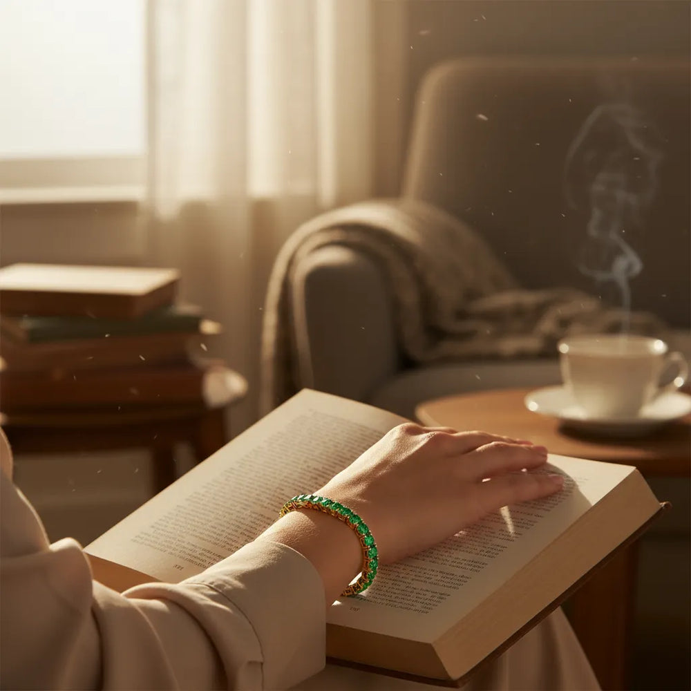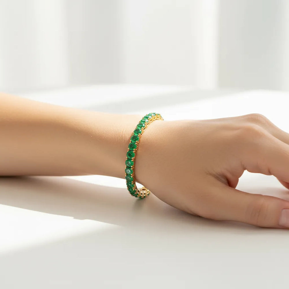 Der kolumbianische Smaragd, auch bekannt als „König der grünen Edelsteine“, symbolisiert Neubeginn und positive Transformation. Dieses exquisite Tennisarmband strahlt in faszinierendem Grün und ist perfekt für alle, die auf ihrem Lebensweg Hoffnung und Erneuerung suchen.
