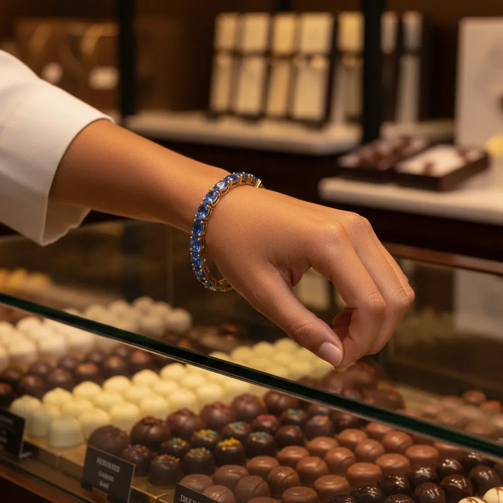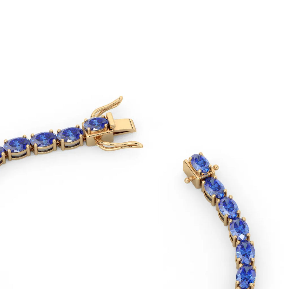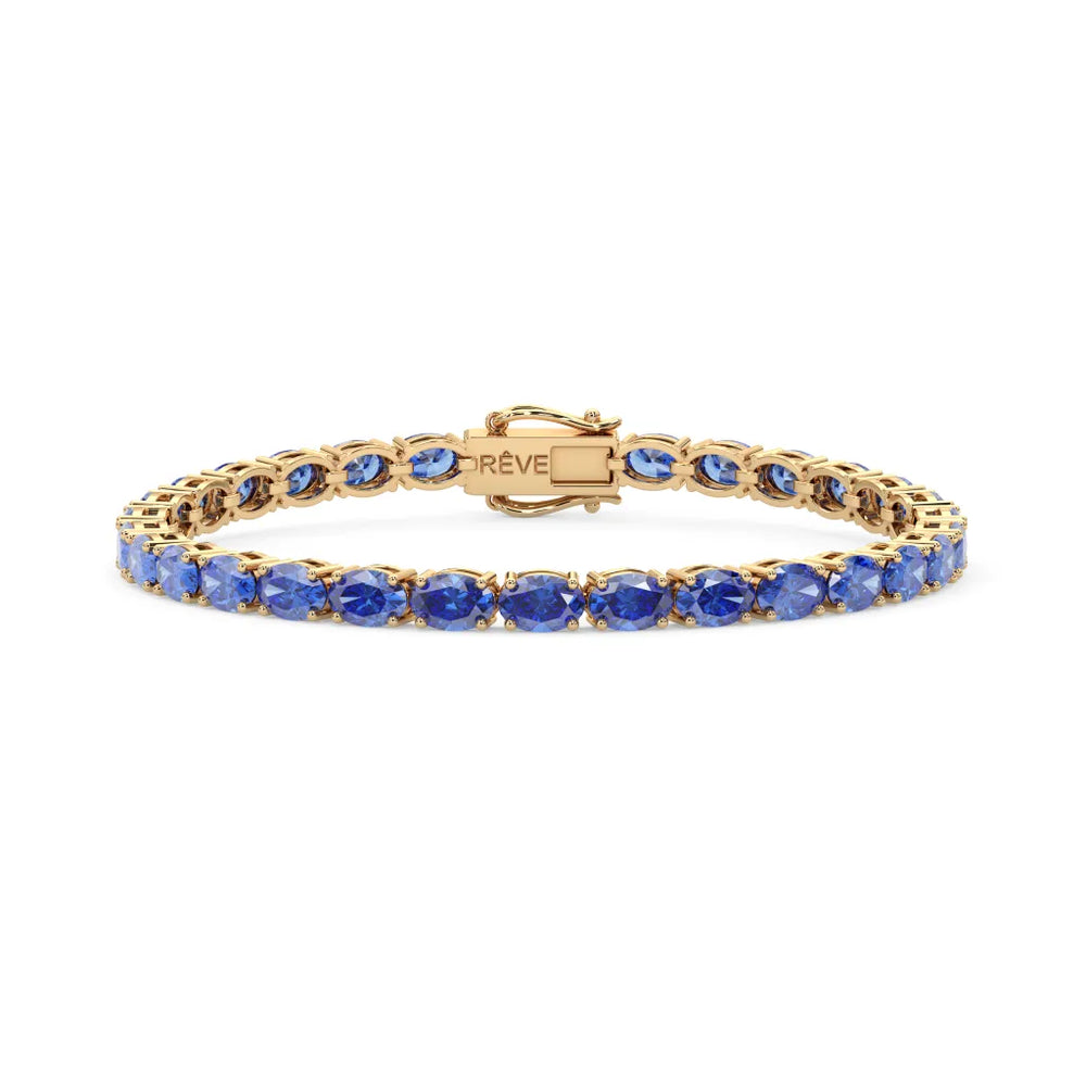 Ein elegantes Tennisarmband mit kornblumenblauen Saphiren, die Gelassenheit, Frieden und Klarheit symbolisieren. Jeder oval geschliffene, im Labor gezüchtete Saphir besticht durch seinen charakteristischen sanften Blauton und verkörpert ruhige Eleganz und geistige Klarheit.