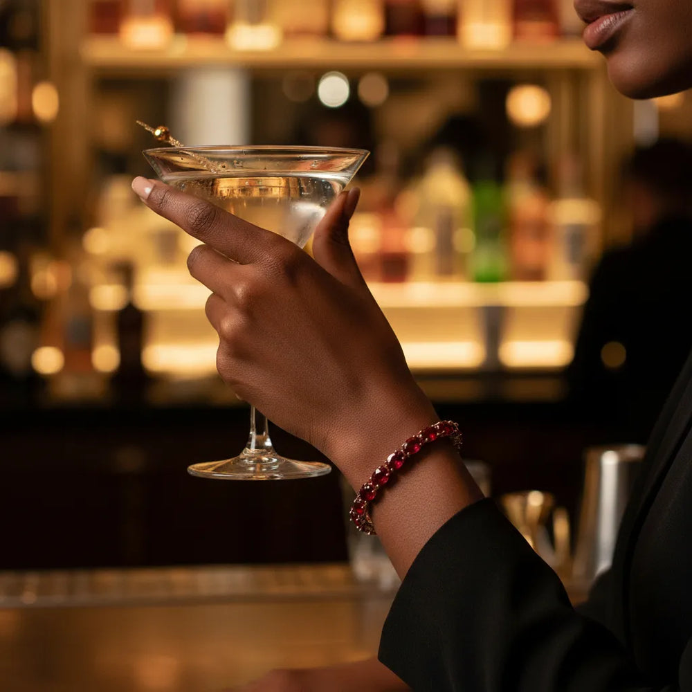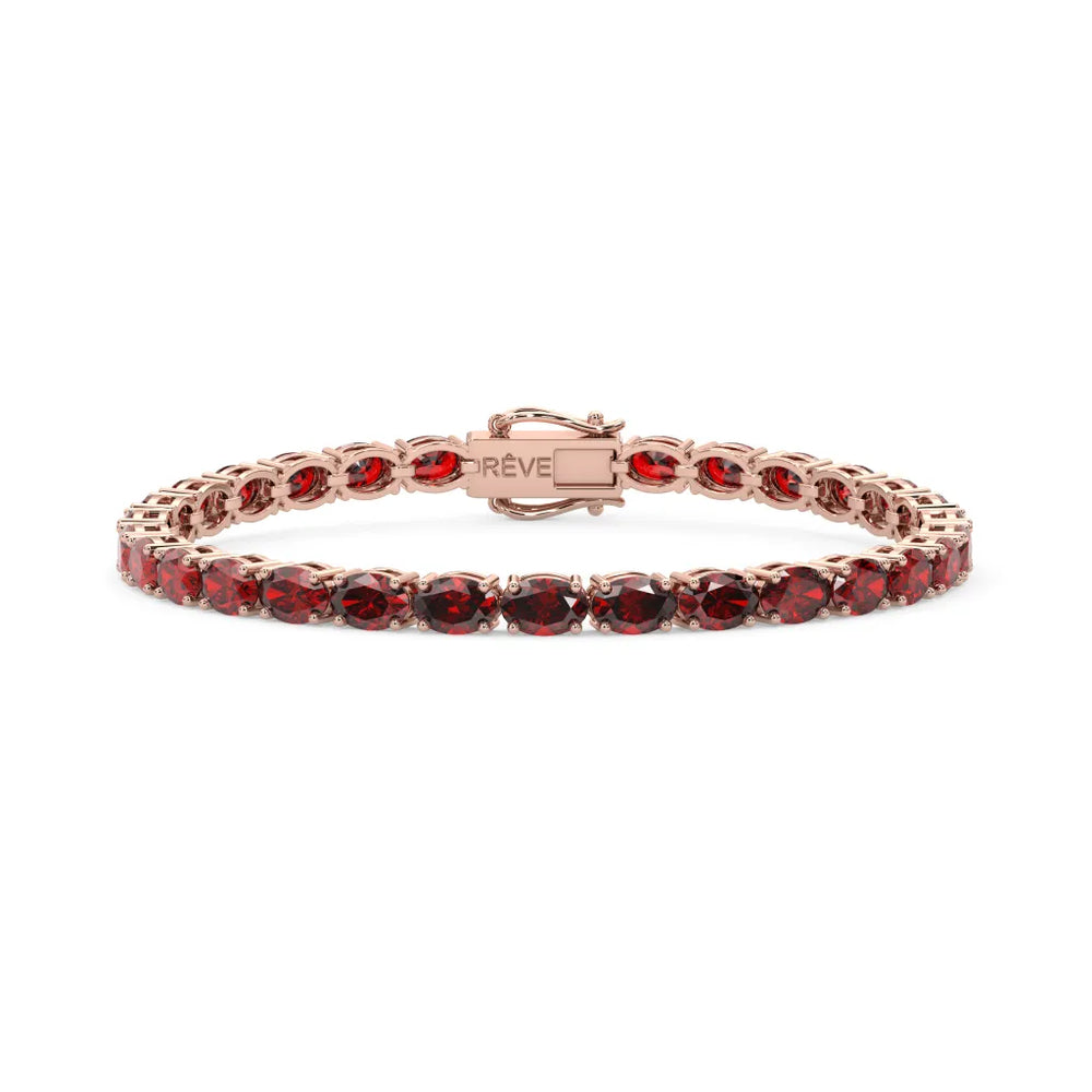 Ein faszinierendes Tennisarmband mit seltenen Taubenblutrubinen, die Leidenschaft, Kraft und Mut symbolisieren. Jeder oval geschliffene, im Labor gezüchtete Rubin strahlt intensives Purpurrot aus und verkörpert Stärke und furchtlose Entschlossenheit.