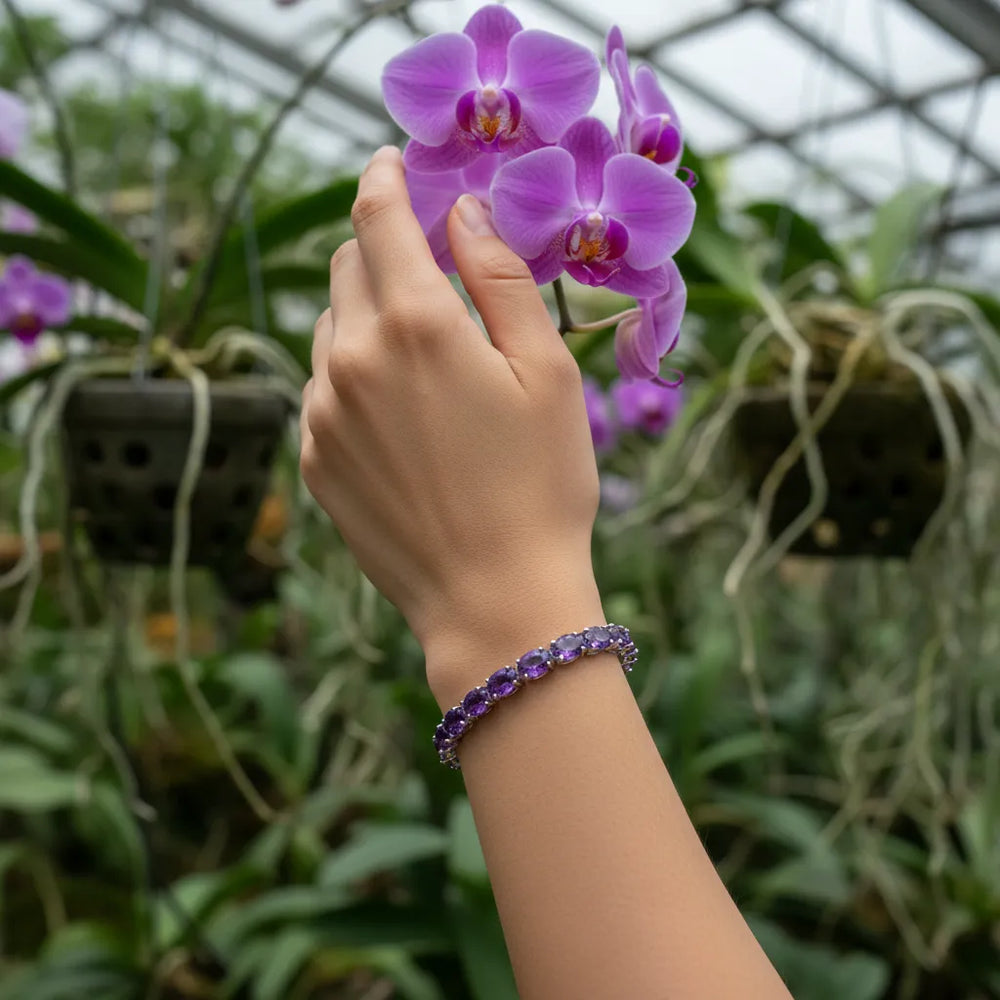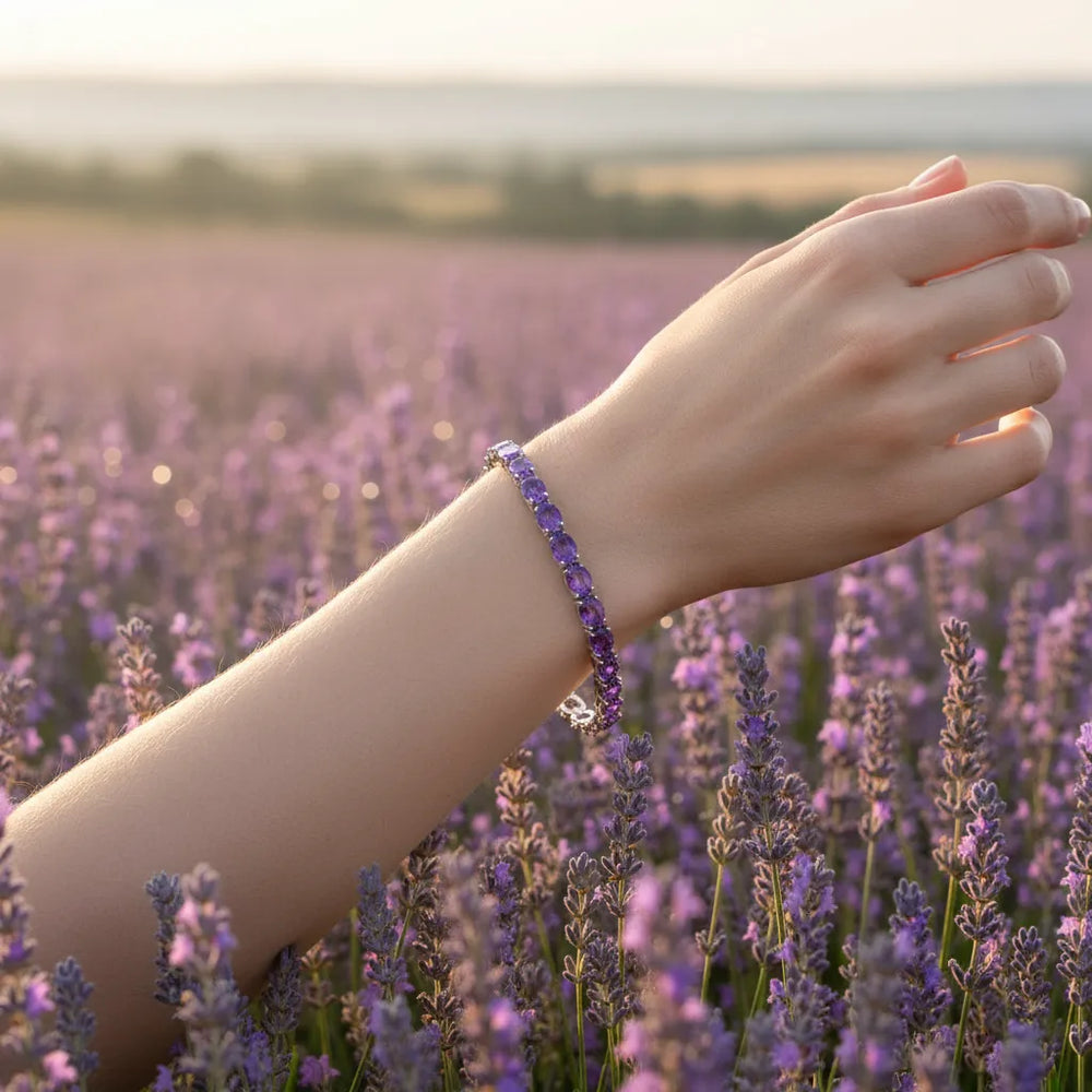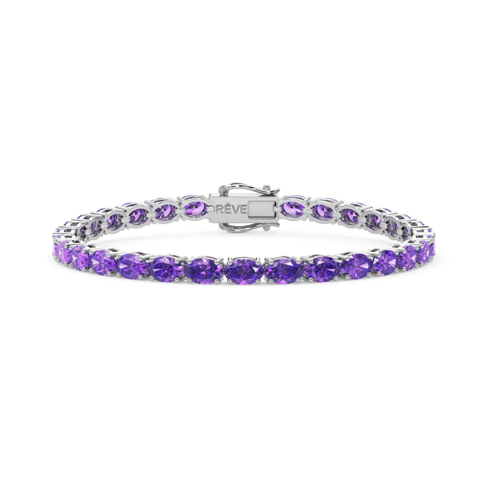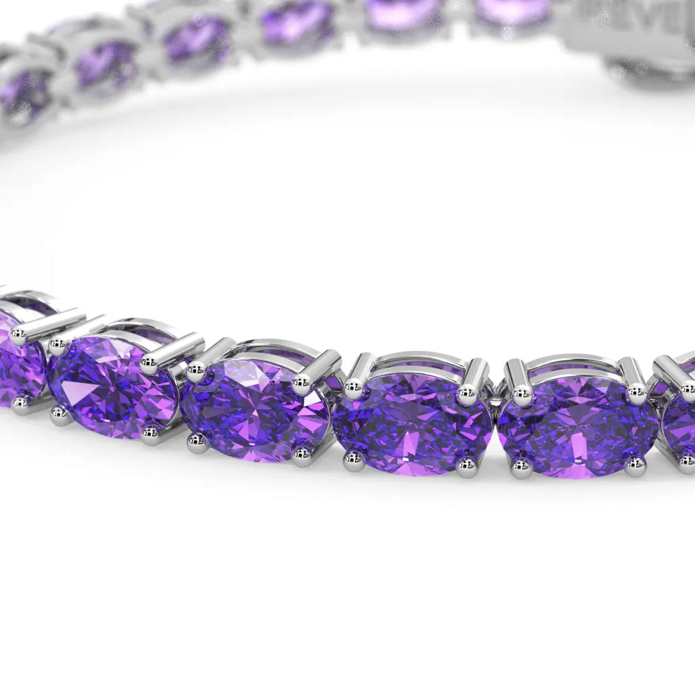 Ein mystisches Tennisarmband mit violetten Saphiren, die Königtum, Geheimnis und Spiritualität symbolisieren. Jeder oval geschliffene, im Labor gezüchtete Saphir besticht durch bezaubernde violette Farbtöne und verkörpert königliche Eleganz und spirituelle Tiefe.