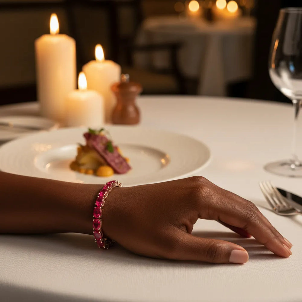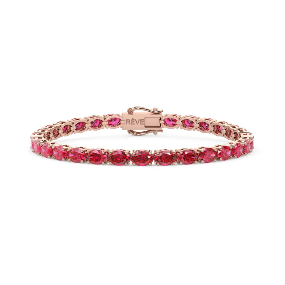 Ein elegantes Tennisarmband mit rosaroten Rubinen, die Romantik, Anmut und Zärtlichkeit symbolisieren. Jeder oval geschliffene, im Labor gezüchtete Rubin schimmert in zarten Rosa-Rot-Tönen und verkörpert sanfte Eleganz und tiefe Zuneigung.