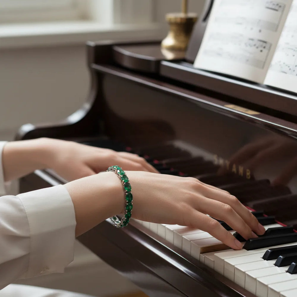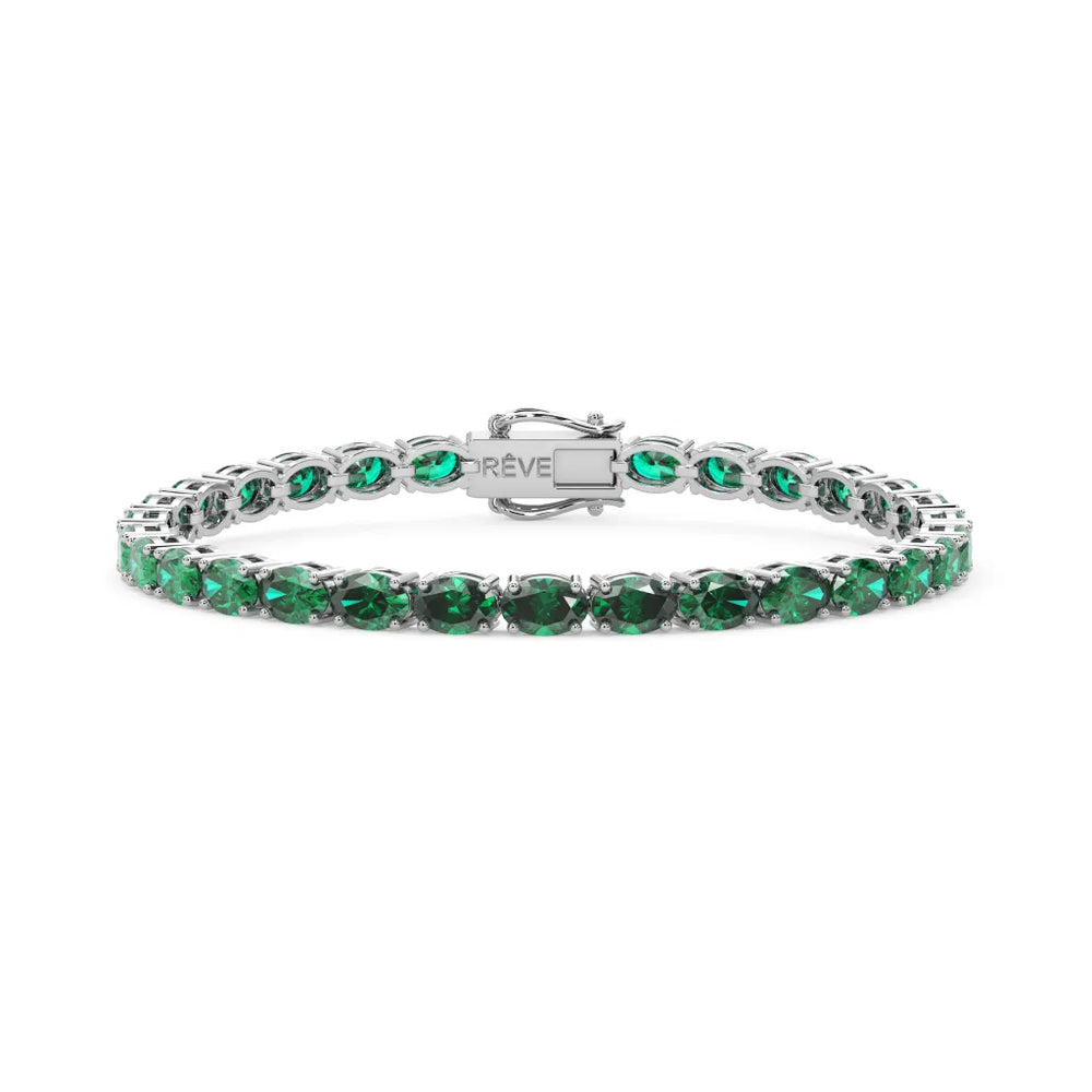 Ein elegantes Tennisarmband mit sambischen Smaragden, die Weisheit, Ausgeglichenheit und Harmonie symbolisieren. Jeder oval geschliffene, im Labor gezüchtete Smaragd besticht durch satte, tiefgrüne Farbtöne und verkörpert inneren Frieden und klare Besonnenheit.