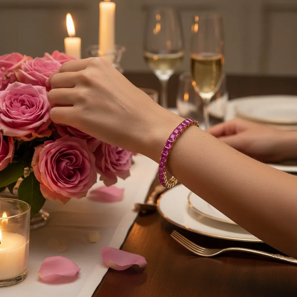 Feiern Sie Liebe und Mitgefühl mit unserem Princess Lab Pink Sapphire Tennisarmband. Jeder zarte, im Labor gezüchtete Saphir verkörpert Anmut und feminine Eleganz – ein zartes Schmuckstück für alle, die tiefe, herzliche Beziehungen schätzen.