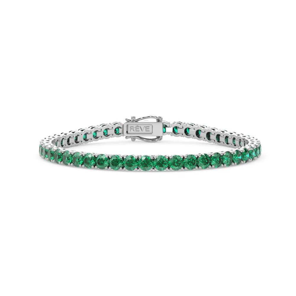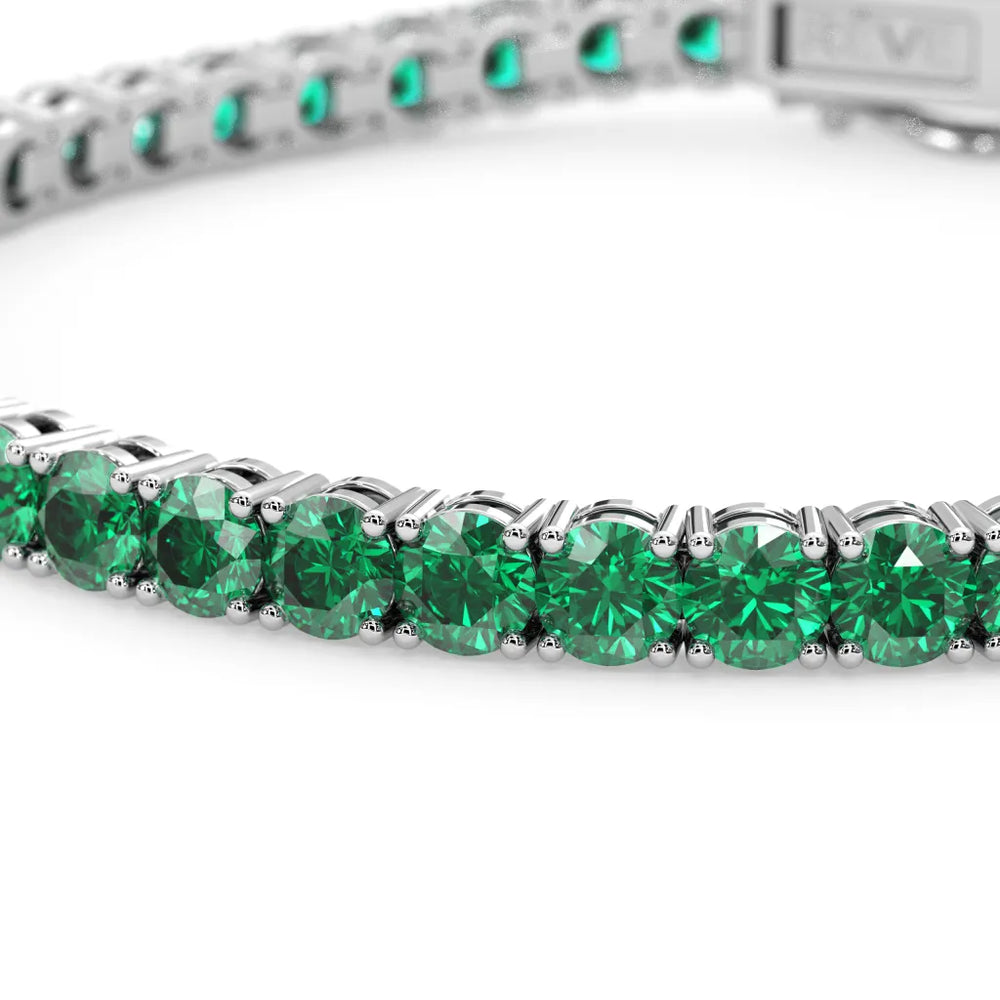 Jeder im Labor gezüchtete sambische Smaragd besitzt die gleiche atemberaubende Qualität wie natürlich abgebauten Steine und ist sorgfältig in ein klassisches Tennisarmband-Design eingefasst, das zeitlose Eleganz ausstrahlt.