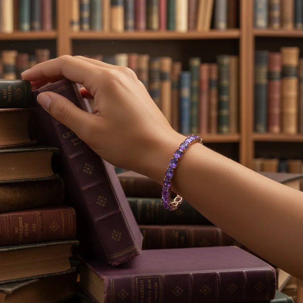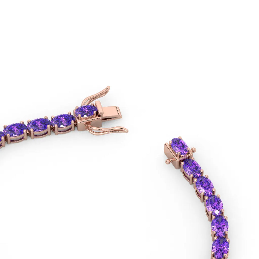 Un bracelet de tennis mystique orné de saphirs violets, symbolisant la royauté, le mystère et la spiritualité. Chaque saphir ovale de synthèse arbore d'envoûtantes nuances violettes, incarnant une élégance royale et une profondeur spirituelle.