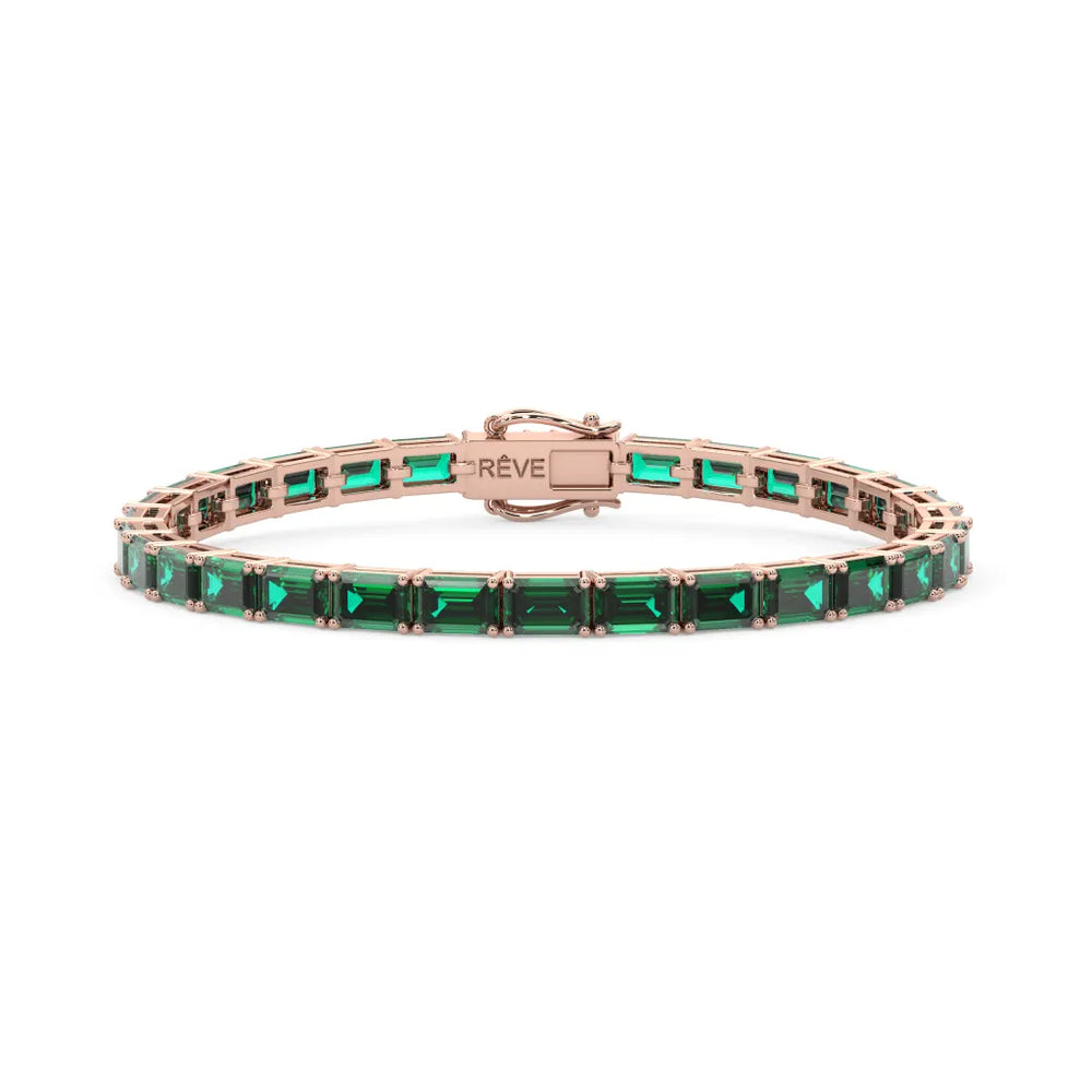 De superbes émeraudes de Zambie cultivées en laboratoire, taillées en émeraude, chaque pierre arborant de profondes teintes bleu-vert, méticuleusement serties dans un bracelet tennis au design intemporel.